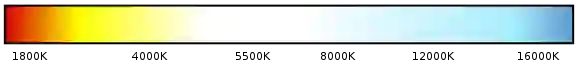 ○ 不同温度的物体会发出不同颜色的光。例如,红红的蜡烛光大约为1850K,晕黄的白炽灯大约为2800K,白色的日光大约为5000K。| 图片来源:Wikipedia