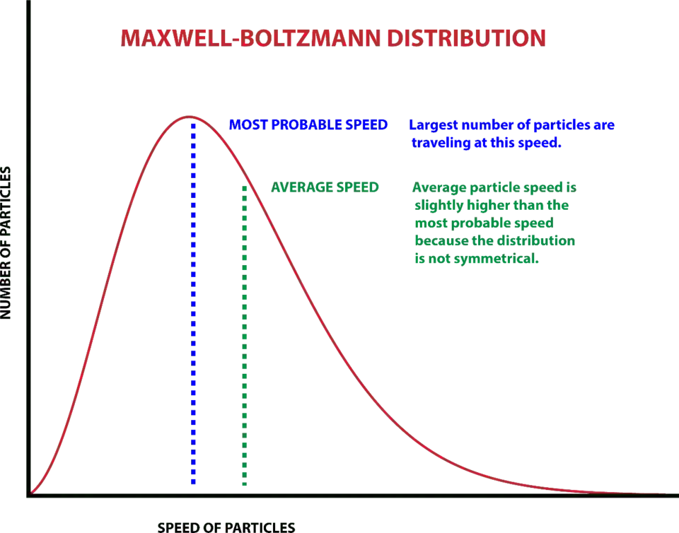 通常,大多数物体的动能包含在平移动能里,也就是物体在空间平行移动具有的能量。气体中的原子和分子沿着各个方向飞速移动,彼此碰撞,也与容器壁碰撞反弹。单个原子和分子的移动速度不同,但是对于某个确定温度下的大量原子和分子,它们的速度可以通过统计和概率的方法来描述,结果表明,粒子的速度(能量)和数量分布遵循所谓的麦克斯韦-玻尔兹曼分布。这意味着,大多数粒子分布在一段特定的速度区间里。