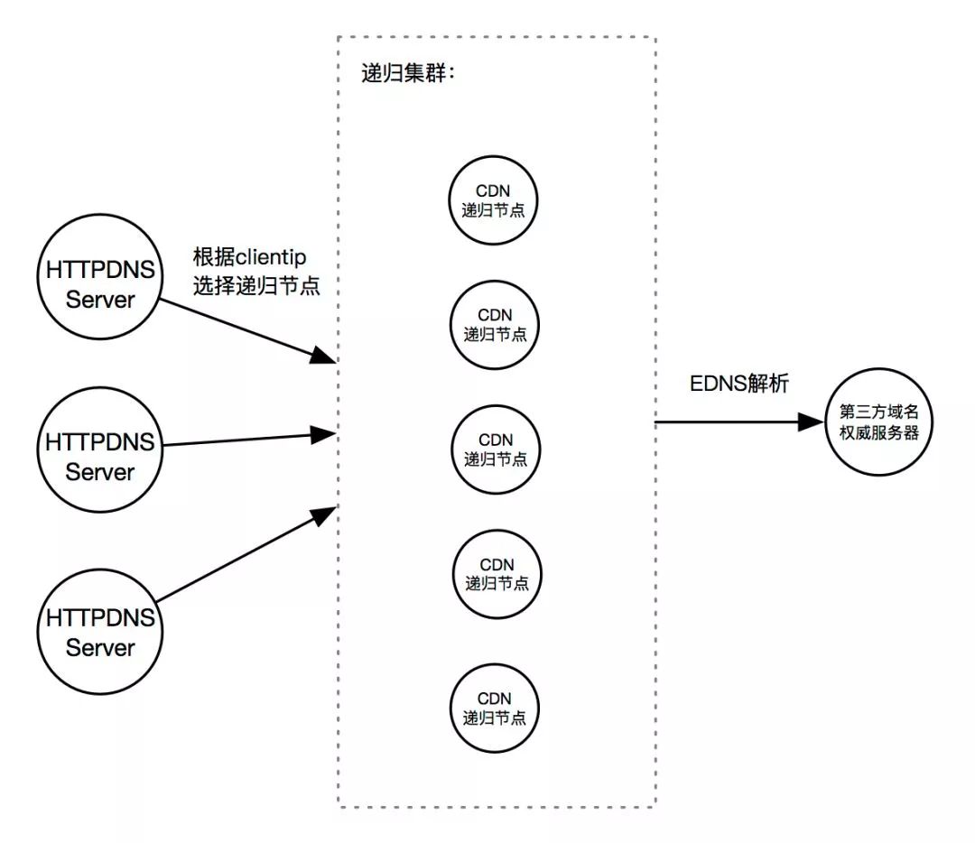 对于第三方域名,百度 HTTPDNS 提供了一套广泛分布的递归集群,尽可能的模拟真实用户,基于 EDNS 协议从权威服务器获取最优解析结果。
