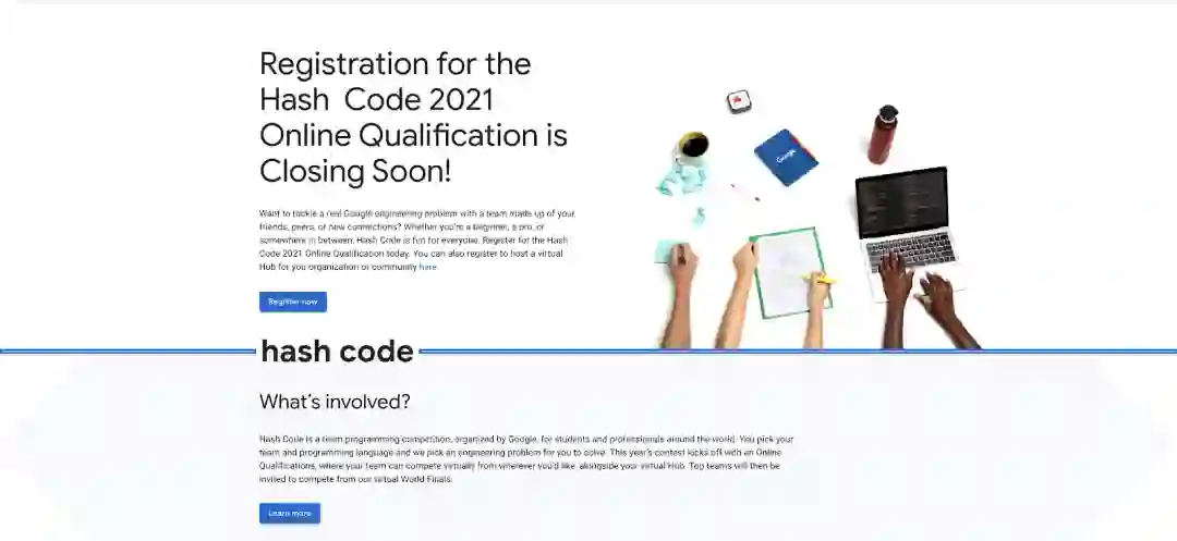 Hash Code 是一项 Google 举办的面向全球学生和开发者的团队编程竞赛。你可选择与你的小伙伴组成两到四人的小型团队并选择你们擅长的编程语言参赛,一起解决实际的 Google 工程挑战中的问题。今年的比赛以在线资格赛拉开帷幕,在线资格赛可以让你的团队随心所欲地与虚拟 Hub 竞争。通过资格赛团队将受邀参加我们的全球总决赛。