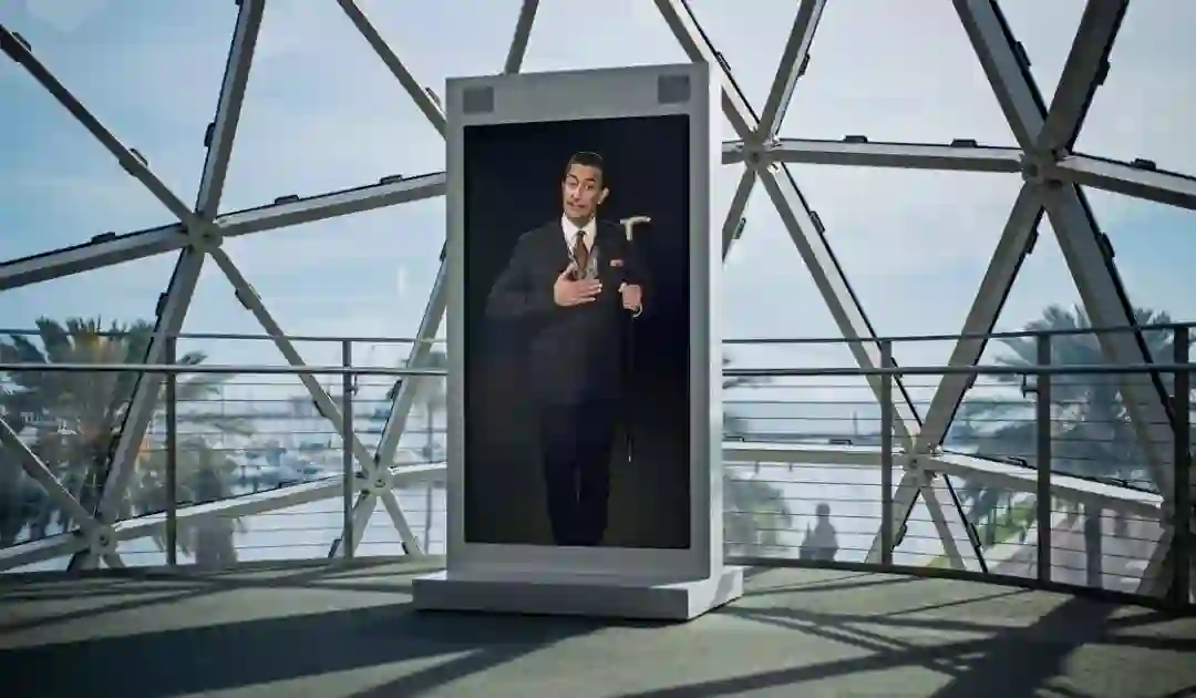 这场展览的体验非常超现实主义。当观众按下机器上的按钮后,达利就会出现在屏幕上,讲述自己的生平。镜头长度大约 45 分钟,且有数千种不同组合,每位观众都可以获得不同的体验。屏幕上会出现达利读报的画面,读的正是《纽约时报》今天的头版。经过训练后,他还可以评论天气。