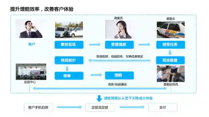 从用户体验上看以往传统保险公司的车险处理流程,一般为报案、现场查勘、提交理赔材料、审核、最终赔付。用户完成整套链路获得理赔的周期往往长达几周甚至一个月。蚂蚁“定损宝”的终极目标不仅仅是服务于保险公司,更要在未来通过深度学习技术解决用户长期的痛点,使得用户在车险理赔过程中可以在现场拍照上传图片,在几秒内就能得到准确的定损结论,并快速获得理赔。