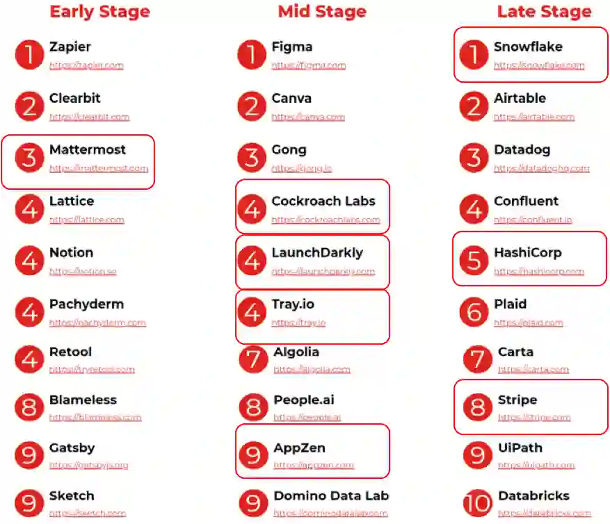 比如Stripe为企业提供省时的付款服务,Snowflake 为企业提供高性能、易扩张的环境去存储大规模的信息,HashiCorp满足了企业日益增长的多云管理的需求,Tray.io通过工作流自动化提高企业的整体效率,LaunchDarkly为企业带来更加高效的产品测试和优化的体验,AppZen帮助企业降低费用滥用和监管不合规的风险。