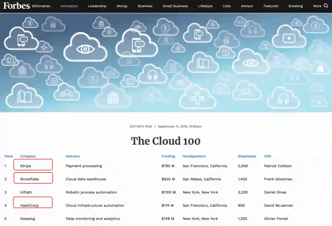 2019年9月11日,由福布斯与Bessemer Venture Partners和Salesforce Ventures合作推出的榜单“福布斯云计算100强”(Forbes Cloud100)正式发布。前五名分别是:Stripe、Snowflake(添加Snowflake文章链接)、UiPath、HashiCorp、以及DataDog。其中,红点创投是第一名Stripe、第二名Snowflake、和第四名HashiCorp的早期投资机构。