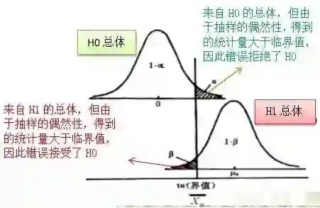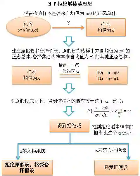 在N-P的思想框中,完全没有提到P值,他们使用拒绝域来对假设进行判别,具体检验思想见下图: