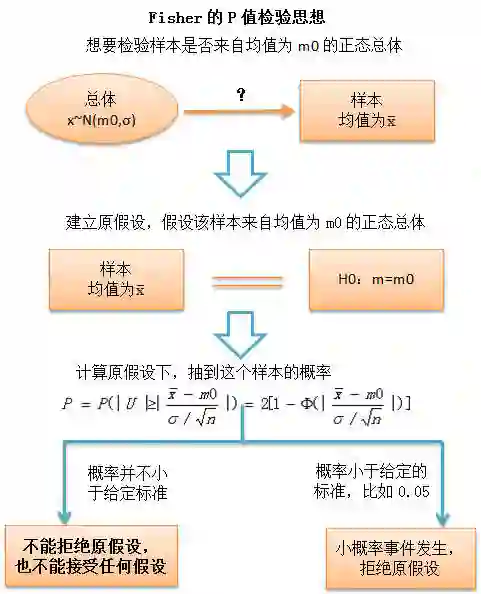 但实际上我们得到的样本均值不是m0,而是,那么Fisher他老人家当时的想法是:在一个样本均值为m0的正态总体中,抽样得到这个均值为的样本的几率会有多大?我要是能计算出这个概率,就知道“这个样本来自该总体”这件事有多靠谱了,如果概率太小,就认为是不靠谱的事情,那么就可以认定这个假设是错的。这就是假设检验里的“小概率事件原理”,这个概率就是后来风靡学术界的“P值”,一般认为概率小于5%,就是不靠谱的事情,则需要拒绝原假设。