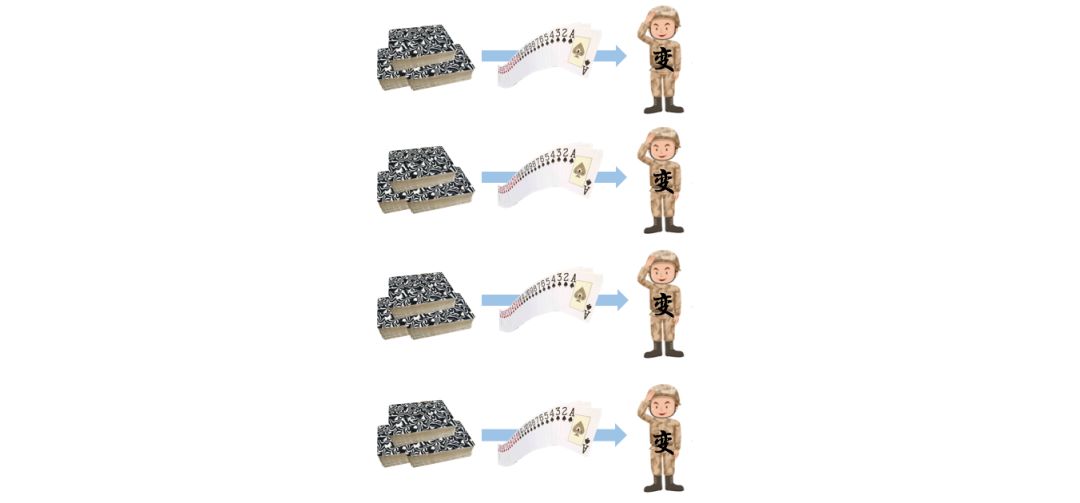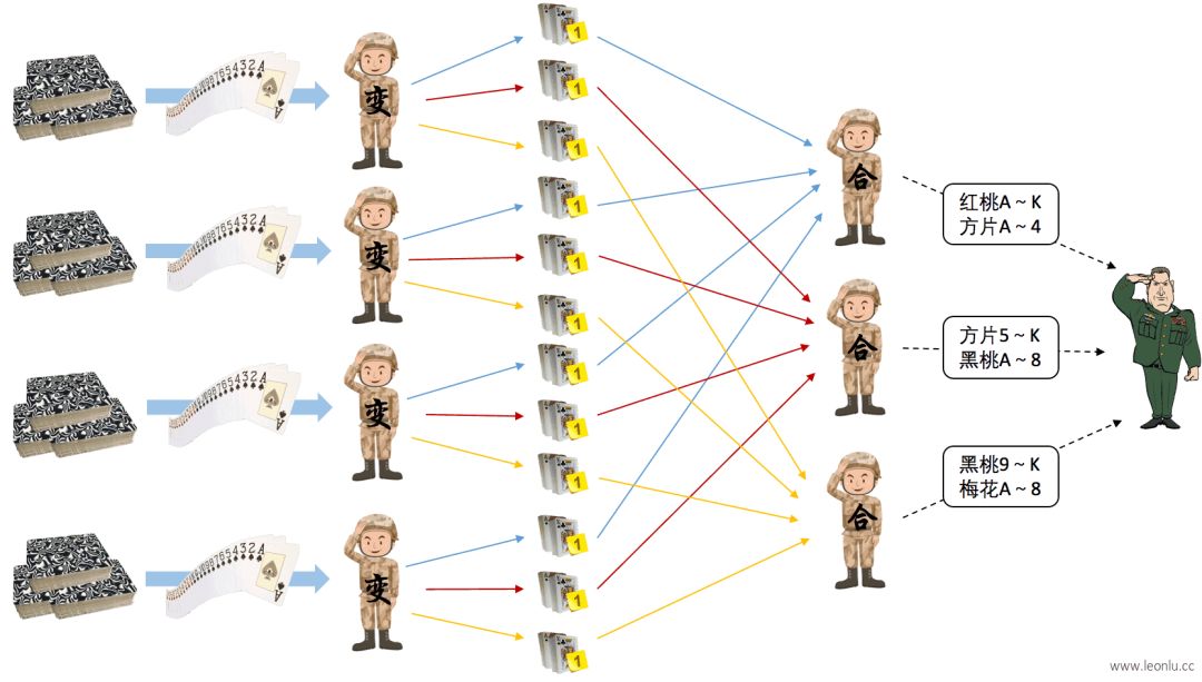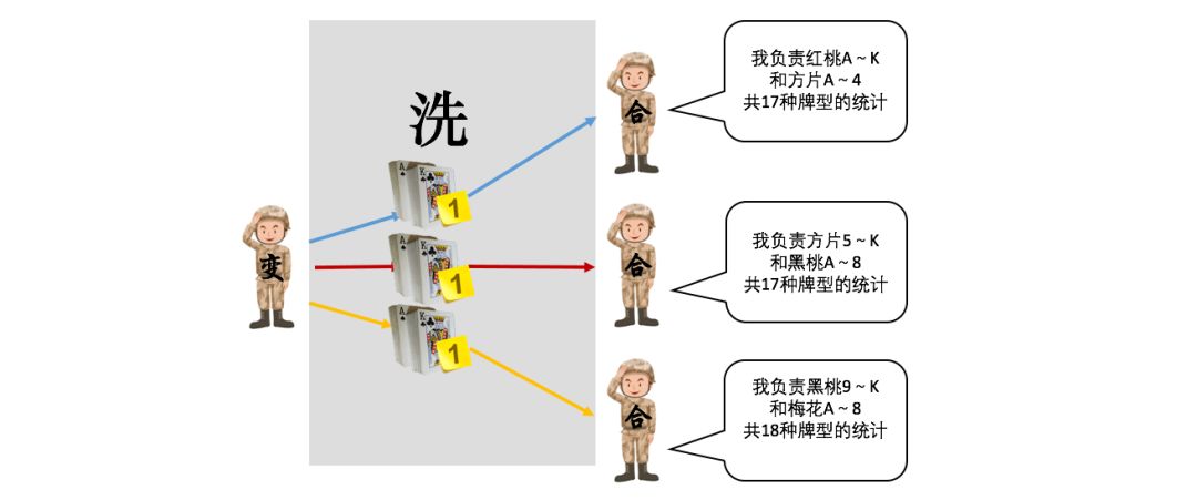 “指挥官”在切分扑克牌之前,会先分配好“变计算兵”和“合计算兵”的数量,然后根据“变计算兵”的数量把扑克拆分成相应的份数,将每份扑克分给一个“变计算兵”,然后进入下一步。