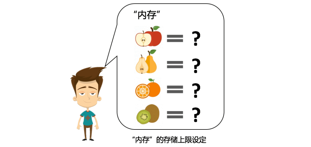 下面我们要用一个简单的案例,分析“人型计算机”是如何利用传统计算技术解决实际问题的。在开始之前,要增加一些限定,如同正常计算机的内存是有上限的,我们的“人型计算机”也存在记忆力的上限,这里我们假设一个“人型计算机”最多可以同时在“内存”中记住4种信息,例如:苹果、梨等四种水果的个数:
