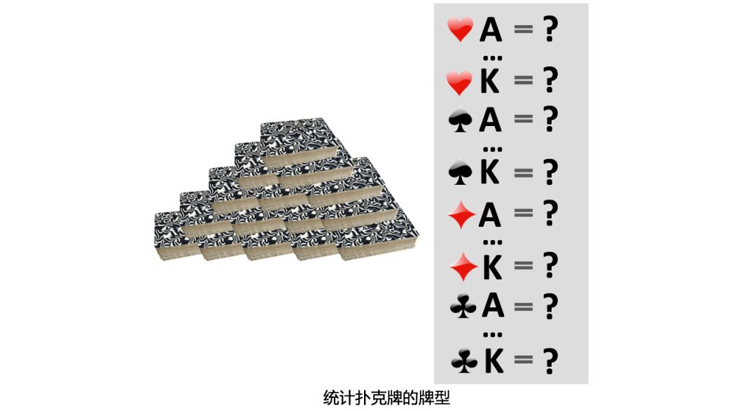 接下来问题的难度要升级了,统计这些扑克牌中A~K共13种牌面每种牌面的个数。我们的“程序”该如何升级?