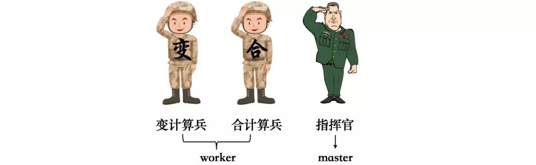 这里我们要讲一下角色分工的问题,多台计算机合作,肯定要有角色分工,我们把负责数据切分的“人型计算机”可以理解为“指挥官”,“指挥官”一般只有一个(在实际中可能有多个),统筹调度之类的工作都归他管。负责执行具体运算任务的“人型计算机”则是“计算兵”,“计算兵”按照承担的任务不同分为“变计算兵”和“合计算兵”,前者负责第二步“变换”,后者负责最后一步“合并”。