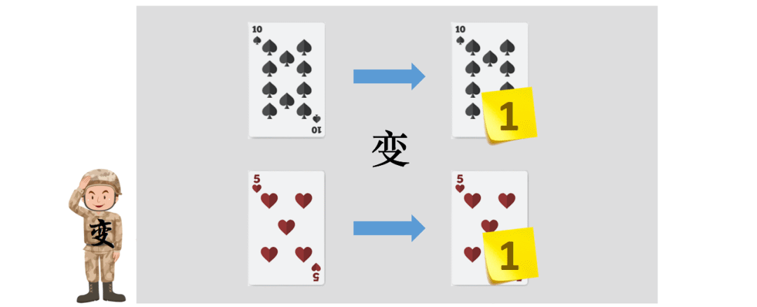 “合计算兵”将手中的变种扑克牌按照相同的计算规则依次进行合并,计算规则也需要根据具体问题来制定,在这里是对扑克牌上标签的数值直接累加,统计出最终的结果。