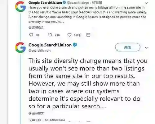 这种站点多样性的改变意味着,一般情况下,你不会在我们的最佳结果中看到来自同一个网站的两个以上的内容列表。然而,系统对于特定搜索内容情况下,我们可能仍然会显示两个以上结果....——谷歌搜索联络(Google SearchLiaison)(@searchliaison) 2019 年 6 月 6 日