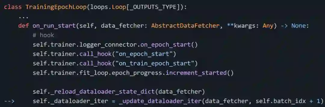 我开始探究 Lightning 源码,查看导致循环(loops)变慢的指令,我发现了一些问题:Loop.run 调用 Loop.on_run_start、Loop.on_run_start 重新加载 dataloader,如下图所示: