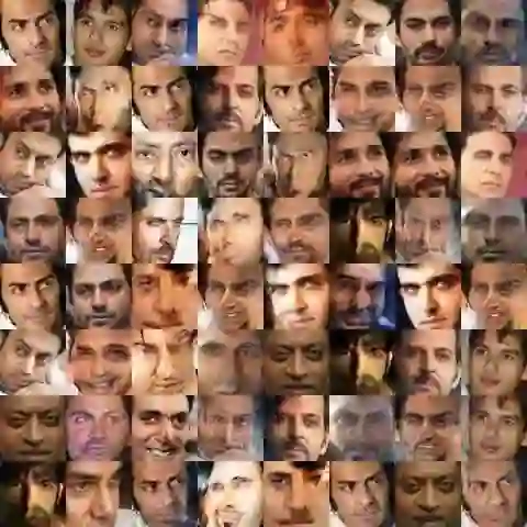 作者 saikatbsk 使用包含印度演员图像的数据集训练网络。下图展示了他的网络在高性能 GPU 上训练100,000 步以后,由生成器生成的一些人脸,效果实在一般: