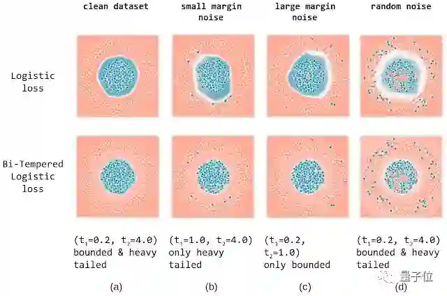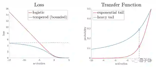 谷歌通过引入两个可调参数的双稳态逻辑损失函数(Bi-Tempered Logistic Loss)来解决上述两个问题。这两个参数分别是“温度”(temperature)t1和尾部重量(tail-heaviness)t2。尾部重量其实就是指传递函数尾部下降的速率。