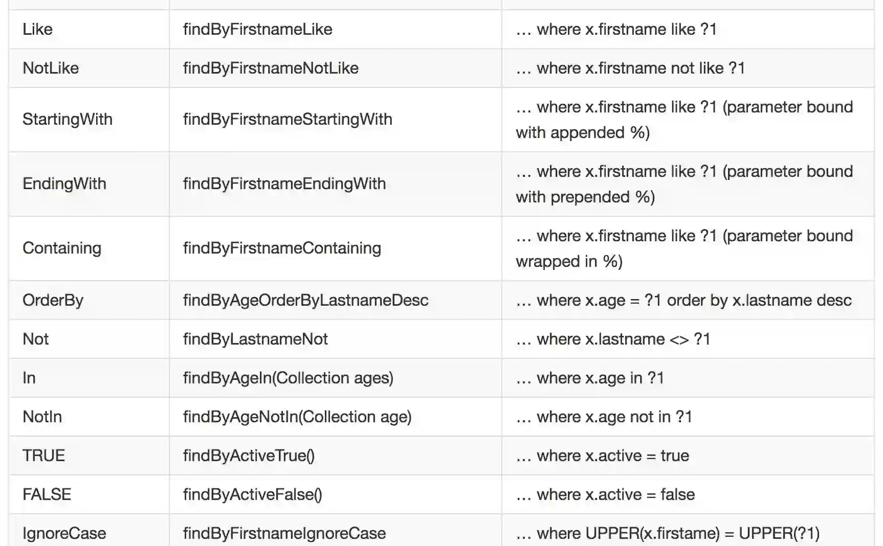 基本上SQL体系中的关键词都可以使用,例如:LIKE、 IgnoreCase、 OrderBy。