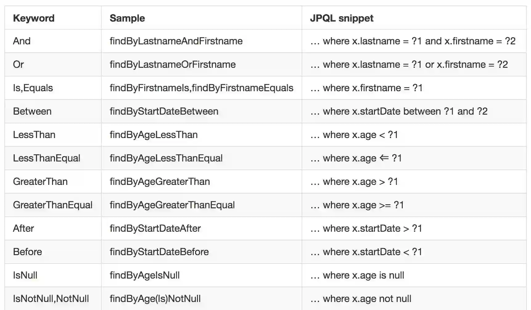 自定义的简单查询就是根据方法名来自动生成SQL,主要的语法是findXXBy,readAXXBy,queryXXBy,countXXBy, getXXBy后面跟属性名称: