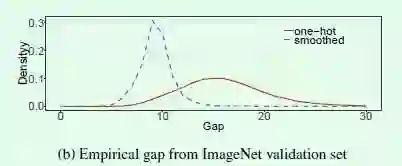2、采用label smoothing,这部分是将原来常用的one-hot类型标签做软化,这样在计算损失值时能够在一定程度上减少过拟合。从交叉熵损失函数可以看出,只有真实标签对应的类别概率才会对损失值计算有所帮助,因此label smoothing相当于减少真实标签的类别概率在计算损失值时的权重,同时增加其他类别的预测概率在最终损失函数中的权重。这样真实类别概率和其他类别的概率均值之间的gap(倍数)就会下降一些,如下图所示。