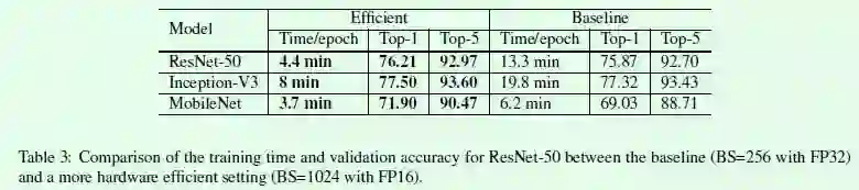 那么这二者的优化效果如何?Table3是采用更大的batch size和16位浮点型进行训练的结果,可以看出和原来的baseline相比训练速度提升还是比较明显的,效果上也有一定提升,尤其是MobileNet。