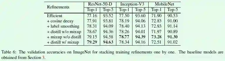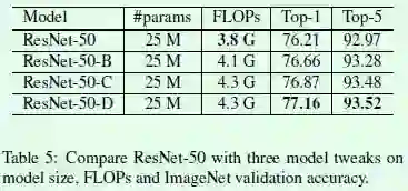 首先可以先来看看作者训练的ResNet50网络的效果。在Table1中对比了目前几个常用分类网络的效果,最后一行是作者通过添加各种训练技巧后复现的ResNet-50效果,和原论文的结果对比提升非常明显(top-1准确率从75.3提升到79.29)。
