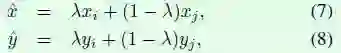 4、引入mixup,mixup其实也是一种数据增强方式,假如采用mixup训练方式,那么每次读取2张输入图像,假设用(xi,yi)和(xj,yj)表示,那么通过下面这两个式子就可以合成得到一张新的图像(x,y),然后用这张新图像进行训练,需要注意的是采用这种方式训练模型时要训更多epoch。式子中的λ是一个超参数,用来调节合成的比重,取值范围是[0,1]。