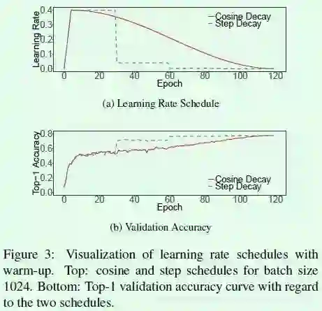 1、学习率衰减策略采用cosine函数,这部分的实验结果对比可以参考Figure3,其中(a)是cosine decay和step decay的示意图,step decay是目前比较常用的学习率衰减方式,表示训练到指定epoch时才衰减学习率。(b)是2种学习率衰减策略在效果上的对比。