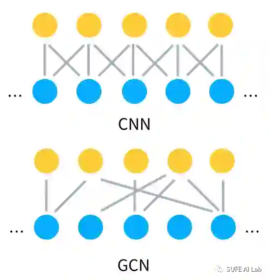 就是节点 i 的最终输出,A是图的邻接矩阵,W表示一个可训练的线性变换权重,b表示一个可训练的偏置项,网络如下图所示看到这里我们可以理解文本GCN和CNN的主要区别在于对节点(token)特征的组合方式更加灵活,也就是说CNN只是按照固定的窗口大小组合位置相近的词,而GCN利用语法树(图的信息)组合在语义上关系近的词。