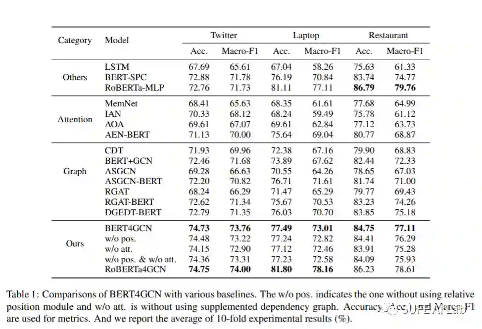 在获得了最后一层GCN输出的单词表示后,作者将当前aspect term的表示进行平均,作为最终的隐藏特征表示,后接一个全连接层和一个softmax层得到概率表示,使用带L2正则项的交叉熵损失进行分类。实验结果如下:BERT4GCN在所有三个数据集上优于所有其他基于BERT的模型,证明了用BERT中间层的语法特征增强GCN可以增强ABSC模型。作者对结果进行了如下分析:
