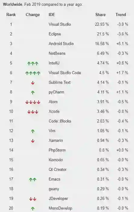 不过官方数据显示,在全球范围内,虽然 Eclipse 排名靠前,但事实上近年来其占比已处于下滑趋势,它过去 5 年的占比下降了 15.7%,Visual Studio 则是当之无愧最受欢迎的 IDE,而 Android Studio 在过去 5 年中增长最多,其占比增加了 13.2%。