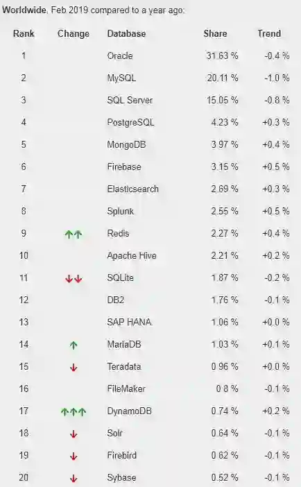 下面继续看看数据库的流行度又是如何,数据库排行榜如下: