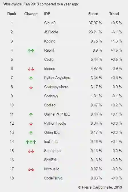 最后看看 ODE(Online IDE),由于在线 IDE 在国内的流行度不是很高,这里就不细说了,我们看看排行榜: