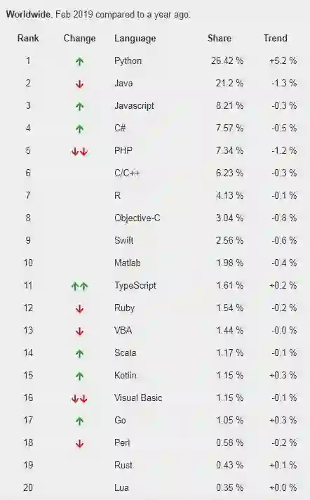PYPL(PopularitY of Programming Language,编程语言流行指数) 二月榜单已发布,目前包含四个排行榜,分别是编程语言、IDE、ODE(Online IDE) 以及数据库这四个。