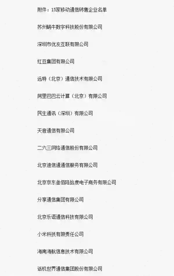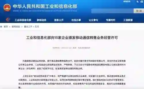 据工信部官网消息,工信部于近日向与中国联合网络通信集团有限公司首批签约的15家企业发放了经营许可证,批准其经营移动通信转售业务。