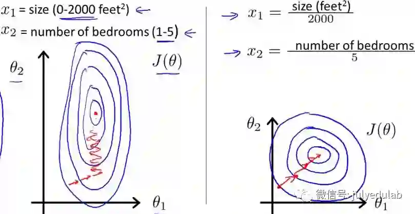 而右图对两个原始特征进行了归一化,其对应的等高线显得很圆,在梯度下降进行求解时能较快的收敛。