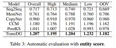 下表3证明,利用外部知识的模型在生成有意义的实体词和不同响应方面比标准Seq2Seq模型具有更好的性能,尤其是论文的模型以最高的实体得分明显优于所有基线。这验证了从KBQA任务迁移知识以进行事实知识选择的有效性。