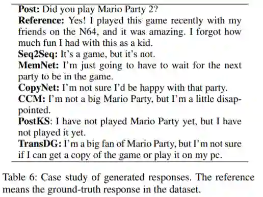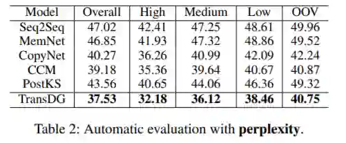 如下表2所示,TransDG在所有数据集上都实现了最低的困惑度,表明生成的响应更具语法性。