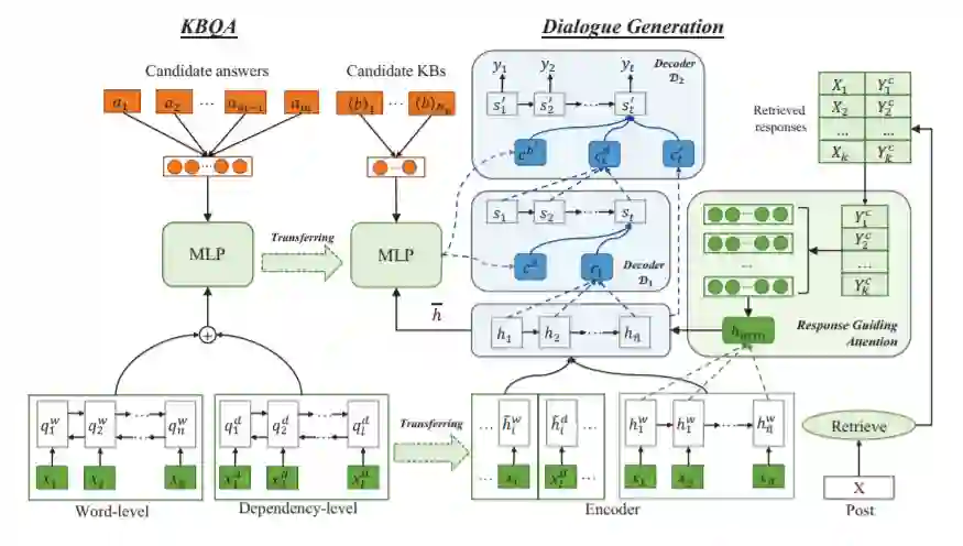 本文提出了一种新的知识感知对话生成模型TransDG,一个迁移KBQA任务的话语表示和知识选择能力来整合常识知识的神经对话模型。此外还提出了一种响应引导注意机制,以增强编码器对输入后的理解,并通过多步解码来优化知识选择,以生成更适当和更有意义的响应。最后大量实验证明了该模型的有效性。
