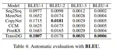 表4中显示的BLEU值表明了字级重叠的比较结果。