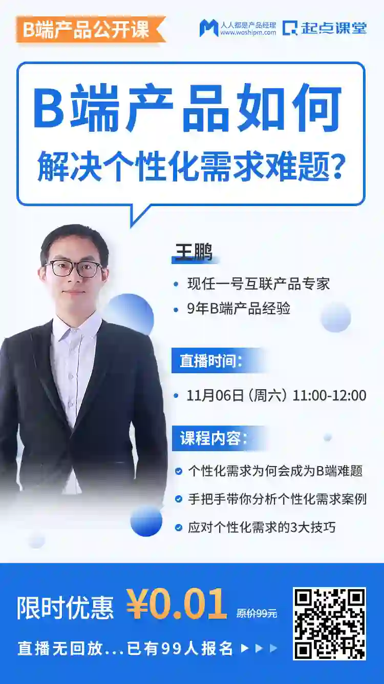 为了帮助更多B端产品的同学,了解B端产品常见的个性化需求有哪些?以及如何处理?人人都是产品经理社区&起点课堂(原起点学院)准备了一场B端产品经理公开课。