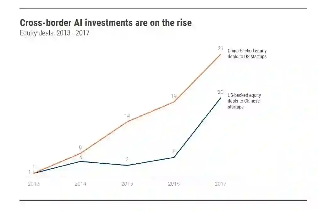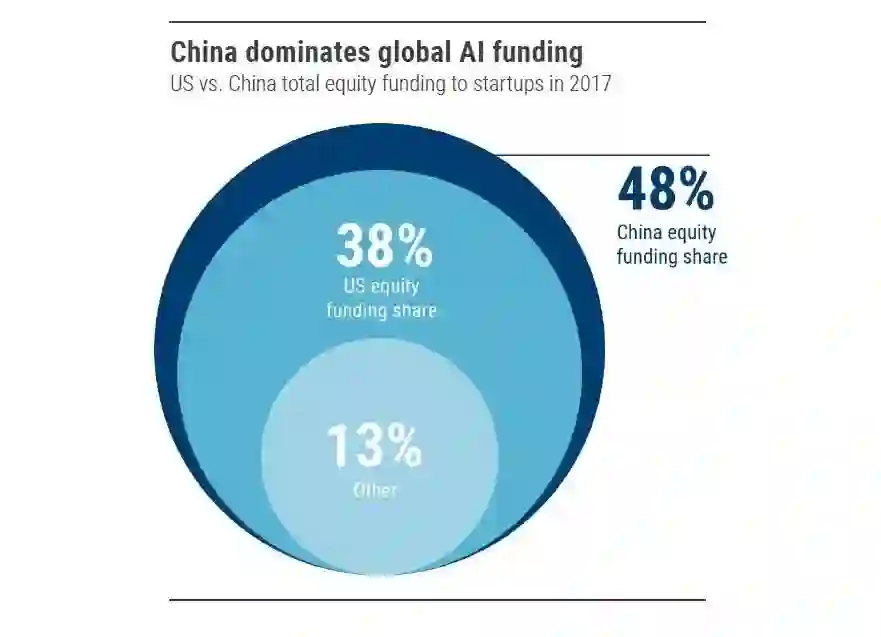 在AI领域,中国正努力超越美国和其他西方国家,政府已经投入了大量精力和资金。2017年中国人工智能初创公司投入在全球占比48%,并首次超越美国占据榜首。据CBInsights预测,2018年就人工智能创业公司和总股本交易数量而言,美国在全球仍将领先,但其正在逐渐失去全球交易主导地位。