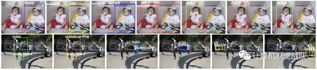 InteractNet在测试图像上的结果。每个子个体可以采取多个操作并影响多个对象。