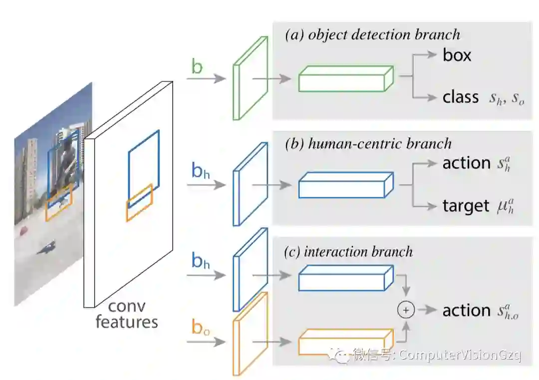 我们将学习人-对象交互作为一个多任务学习问题:上图所示的所有三个分支都是联合训练的。