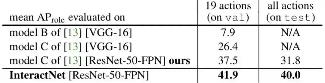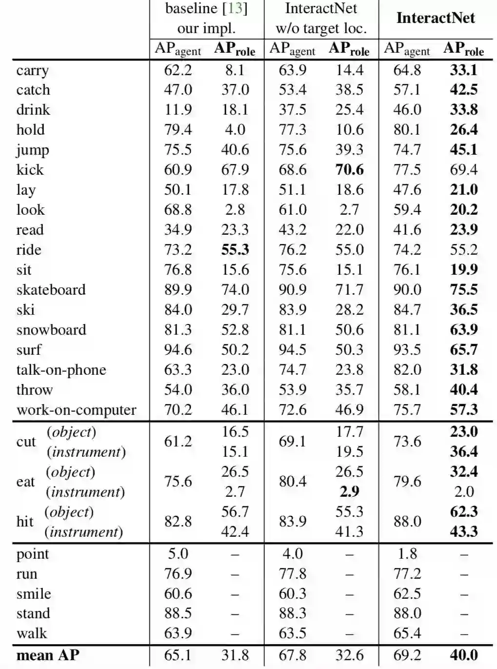 V-COCO试验的详细结果。为每个动作显示两个主要基线和InteractNet。在[13]中定义了26个动作,由于3个动作(cut, eat, hit)涉及两种目标对象(instrument and direct object),因此有26项。在AProle上大胆地展示了领先的项。