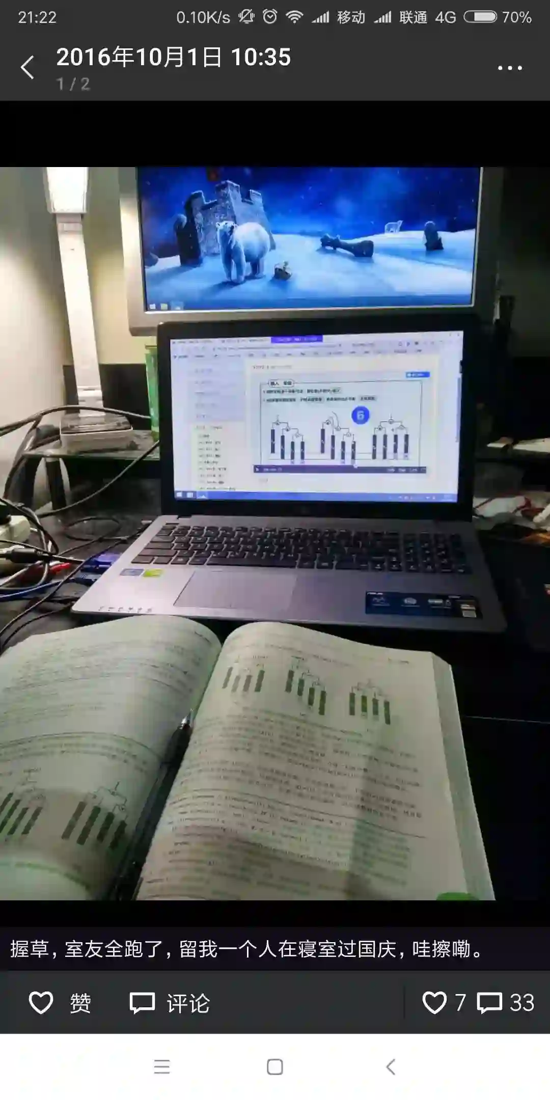 我还发现了一张自己在2016年找工作三刷数据结构时发的朋友圈,当时是国庆节,我在寝室一边看视频课程,一边看书,大家可以看下面这张图,书上的那一页内容是不是和上面那张图是同一页?