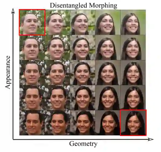 在此基础上,可以实现解耦的人脸插值变形应用,如下图以左上角和右下角作为起止点,对相机、几何、材质进行线性插值: