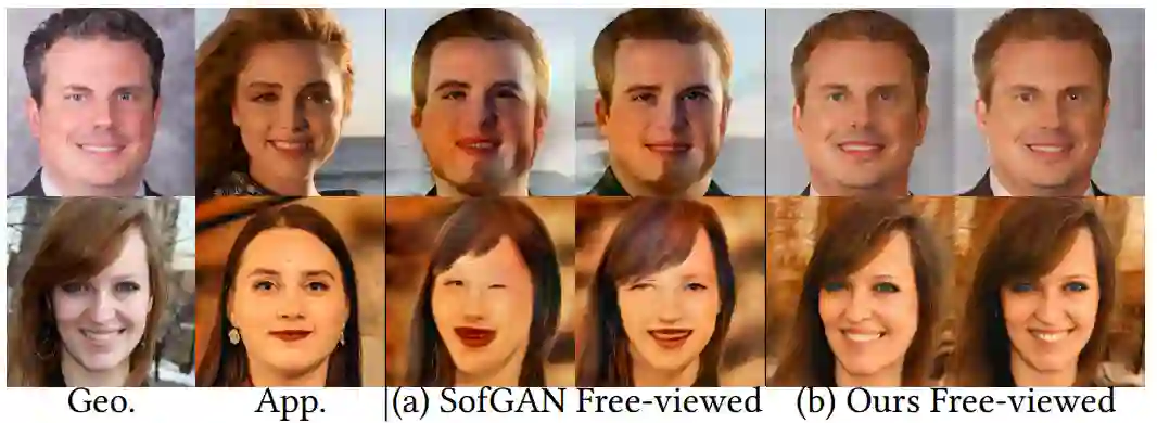 该方法的三平面表示结合了传统的二维生成对抗网络和最新的三维隐式表征,因此继承了 StyleGAN [4] 的强大生成能力和神经辐射场的表征能力。但是,这些生成模型并不能对人脸的几何和材质进行解耦控制,而解耦控制几何和材质是三维角色设计等应用不可或缺的功能。