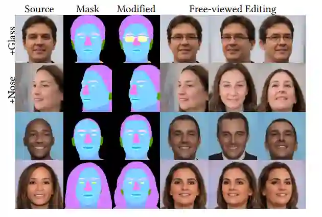 但是,图像的解耦与编辑方法,很难直接应用至三维空间。而现有的三维人脸的几何和材质解耦方法往往需要重新训练网络参数,而且使用的空间表示方法有较大的局限性,缺少三平面表示的良好性质。为了解决上述的问题,NeRFFaceEditing 在三平面表示的三维生成对抗网络的预训练模型参数的基础上,利用任意视角的二维语义掩码作为媒介,实现对三维人脸进行几何编辑和对材质的解耦控制。