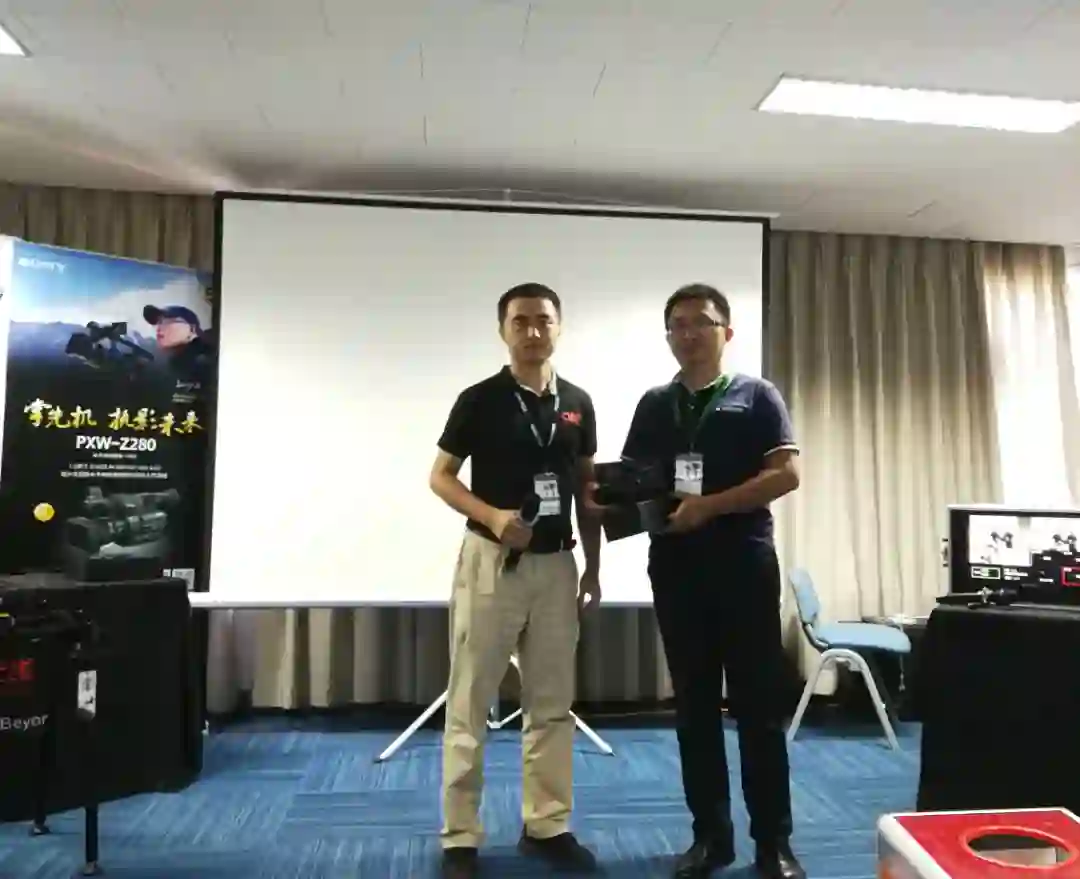 当天与会并上台进行技术分享的厂家代表分别是:视晶无线的董事副总经理袁立先生,索尼中国专业系统集团产品经理郑良红女士,LiveU副总裁Yaal Eshel 先生,目睹直播CEO鲁力先生。而且在分享结束之后,还进行了抽奖环节,奖品是视晶的幻影系列无线图传和运动直播图传Freestream。