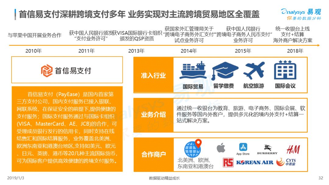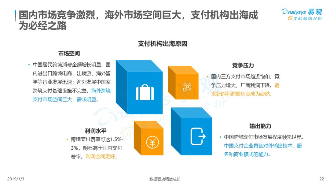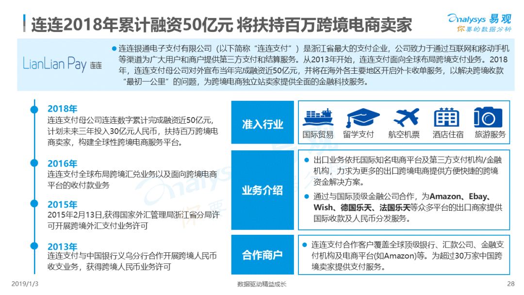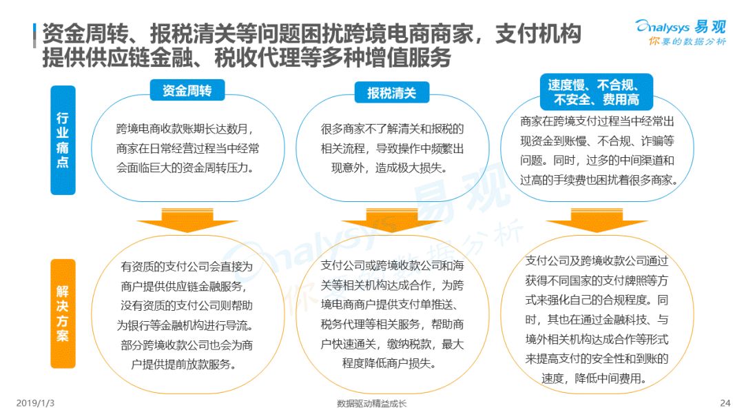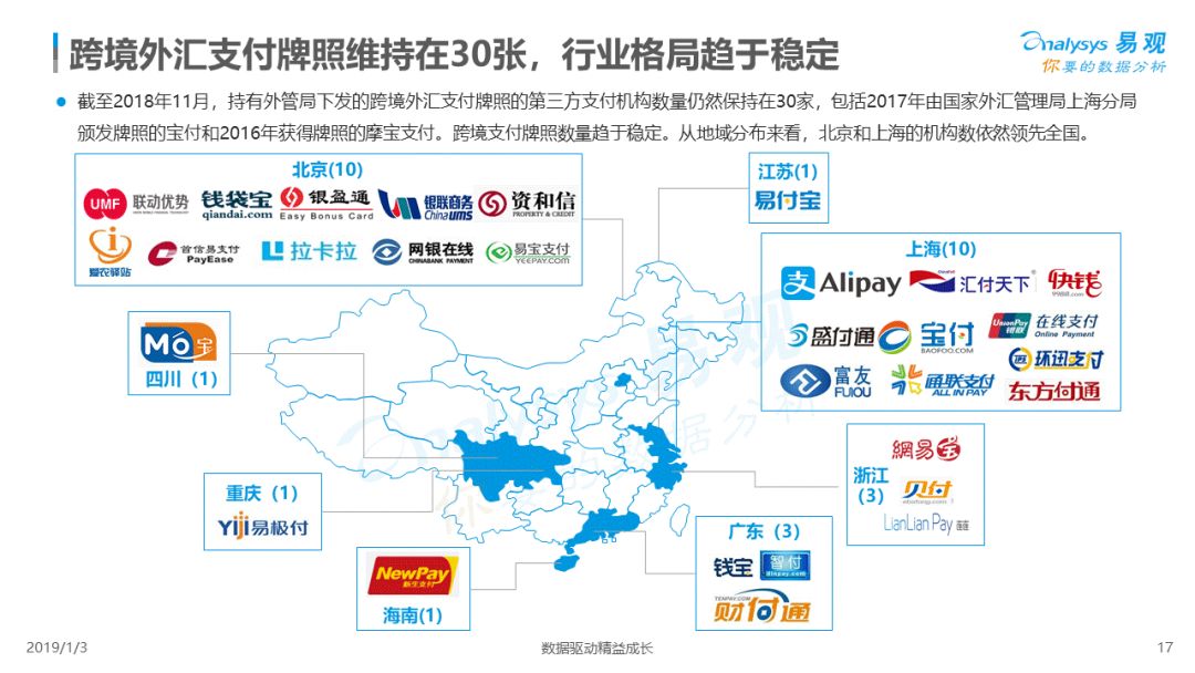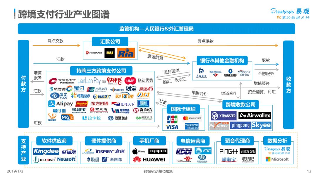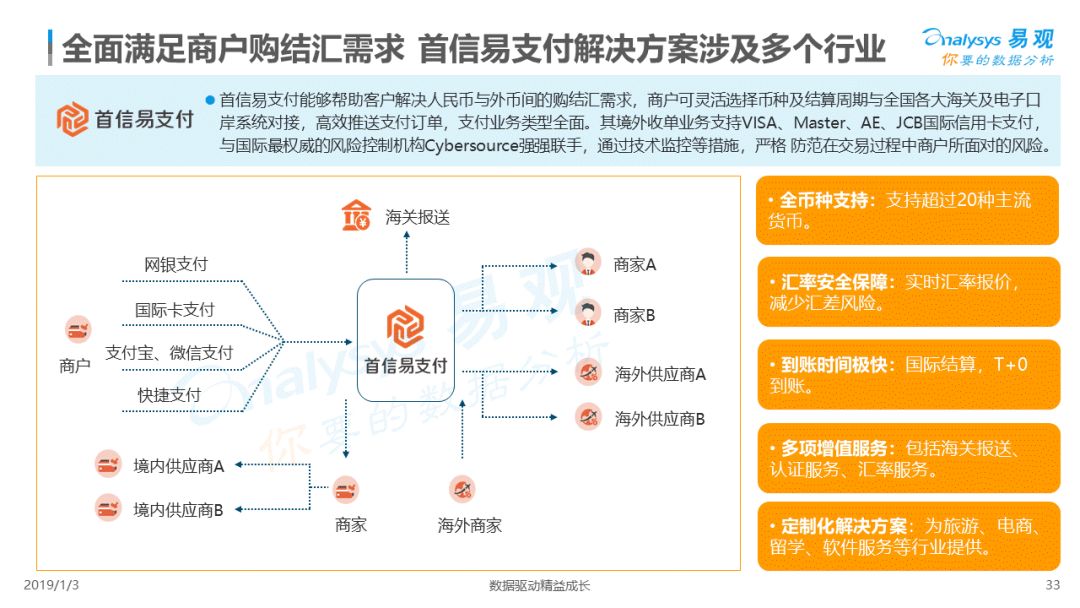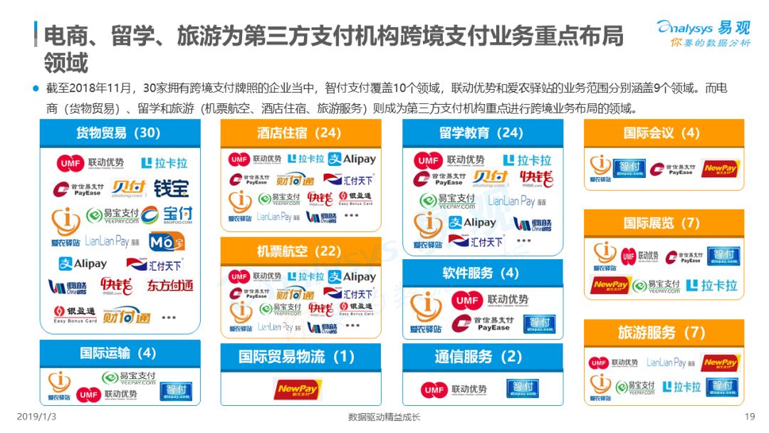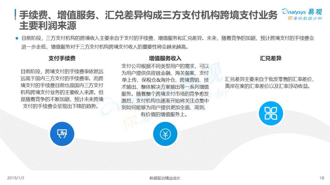 2019年1月,易观发布了《中国跨境支付行业专题研究2018》的行业专题分析报告,主要对目前跨境支付行业的市场环境、发展状况、关键业务节点、典型厂商及未来发展趋势做了详细的研究分析。