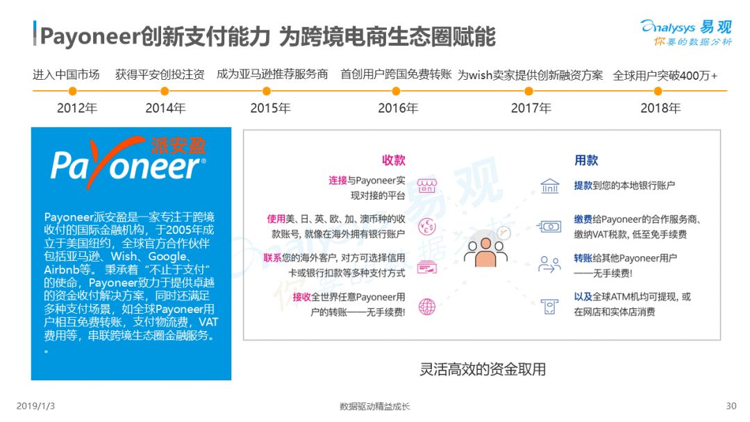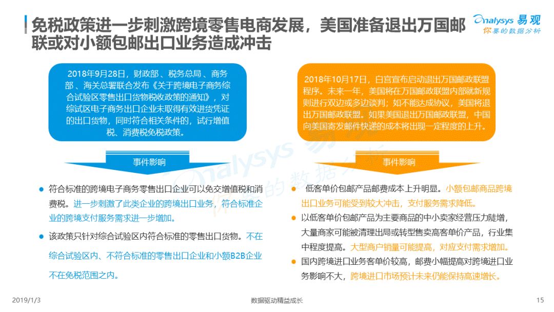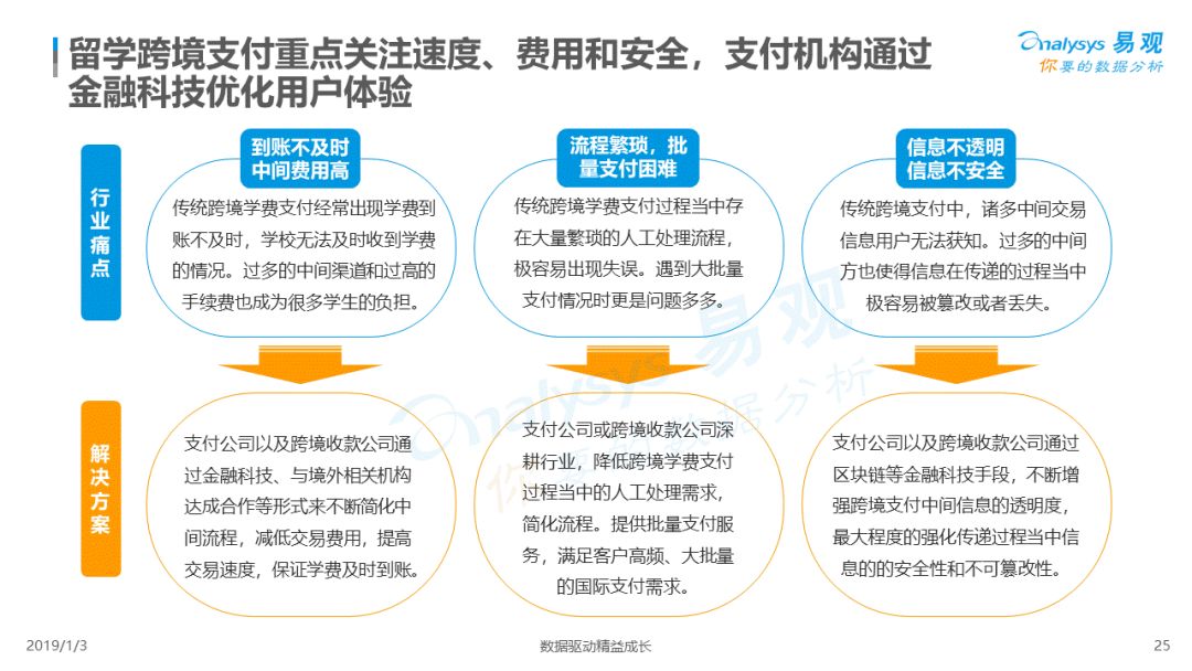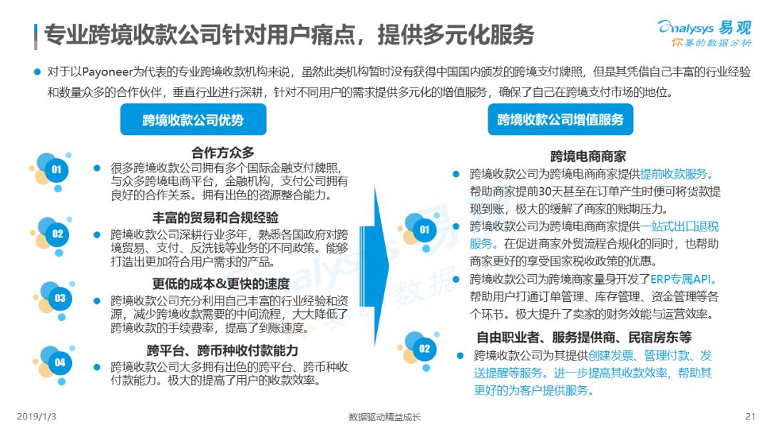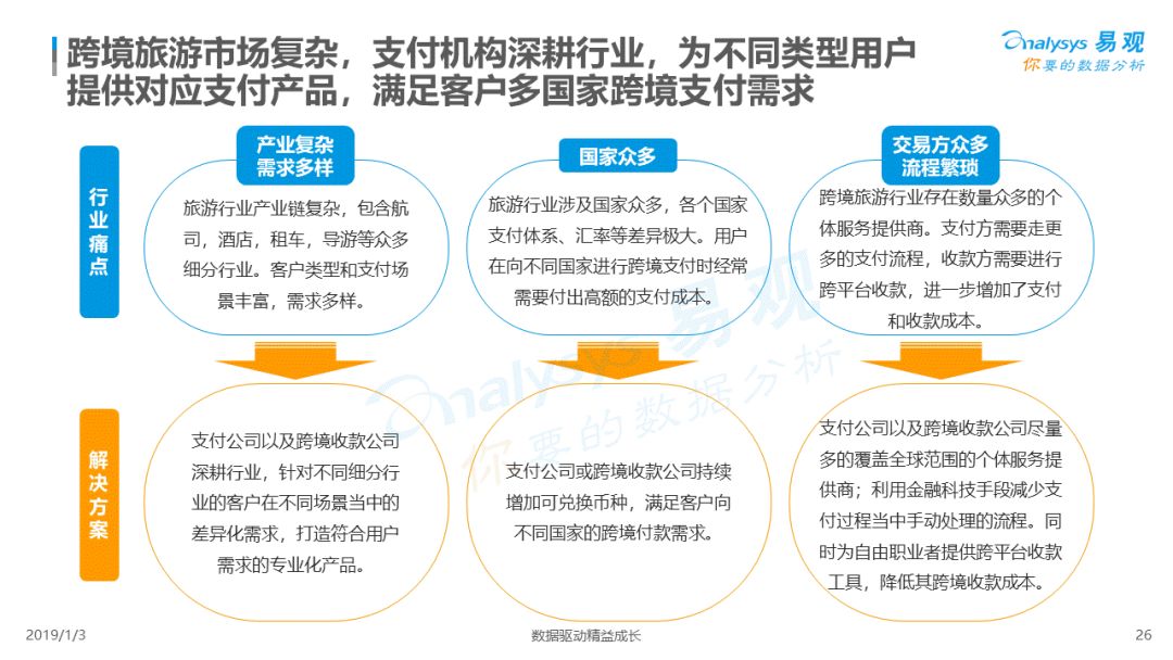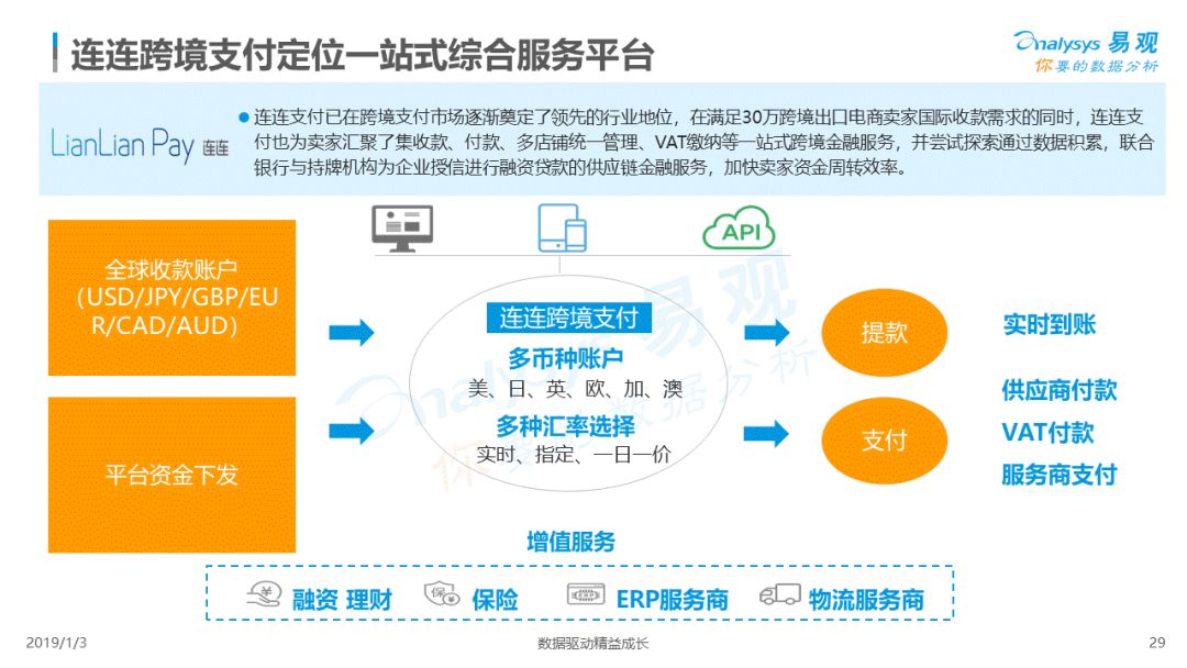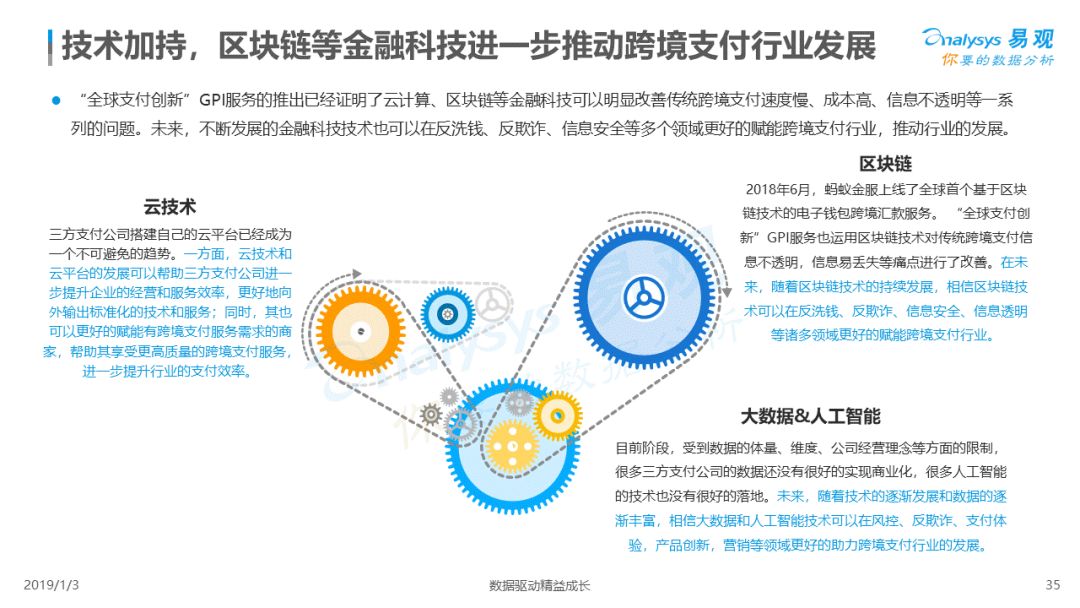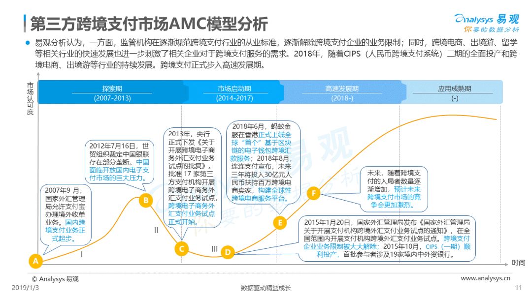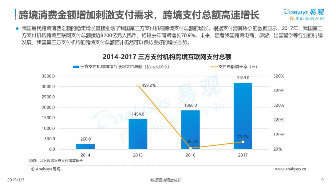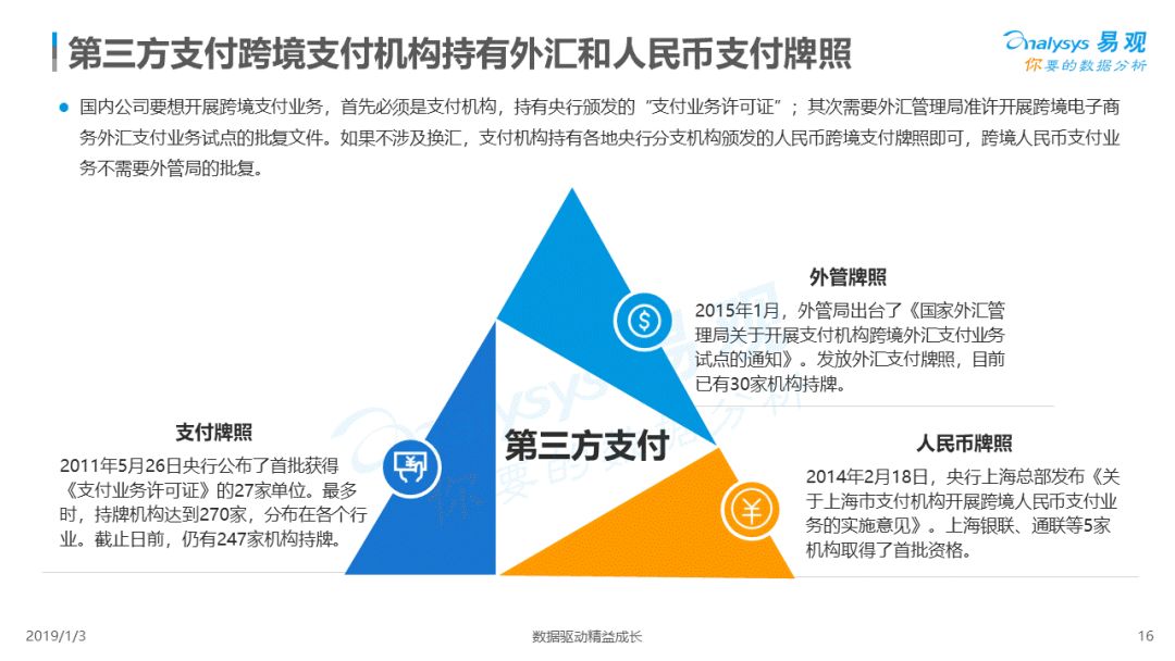 2019年1月,易观发布了《中国跨境支付行业专题研究2018》的行业专题分析报告,主要对目前跨境支付行业的市场环境、发展状况、关键业务节点、典型厂商及未来发展趋势做了详细的研究分析。
